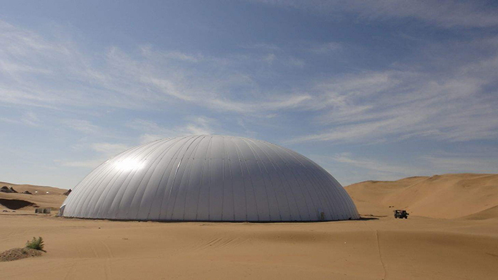 充氣膜結構是一個相對密閉的空間結構,與傳統空間結構建筑不一樣的是,它通過風機向結構內部鼓風送氣,使膜結構內外保持一定的壓力差,以保證膜結構體系的剛度,維持所設計的形狀。